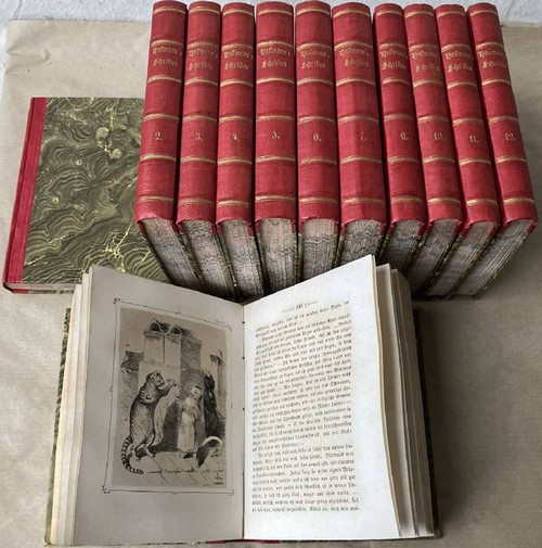 Neue Ausgabe (= 2. Druck) der erstmals 1844/45 erschienenen E. T. A. Hoffmann-Gesamtausgabe mit den Illustrationen von Theodor Hosemann.. 2 Bll., 351(1) S., 2 Bll., 357(1) S., 2 Bll., 342 S., 2 Bll., 340 S., 2 Bll., 399(1) S., 2 Bll., 400 S., V, 466 S., 2 Bll., 519(1), VII, 307(1), 327(1 S., 2 Bll., 308, IV, 324 S. - ohne die Schmutztitel (Vortitel). Kl.8°. Mit zus. 24 getönten lith. Tafeln (Federlithographien mit Tonplatte) nach Federzeichnungen von Theodor Hosemann. 12 Bände - vollständige Folge.