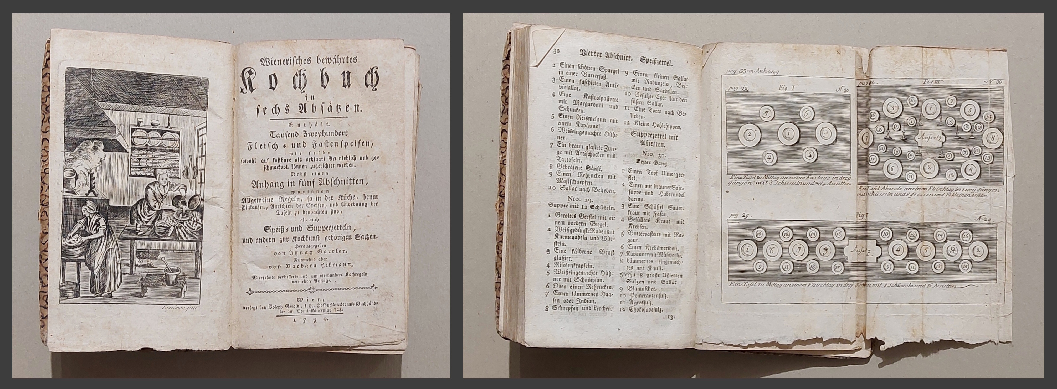 Enthält. Tausend Zweyhundert Fleisch- und Fastenspeisen, wie selbe sowohl auf kostbare als ordinari Art niedlich und geschmachvoll zugerichtet werden. Nebst einen Anhang in fünf Abschnitten, ... Einkaufen, Anrichten der Speisen, und Anordnung der Tafeln ... als auch Speiss- und Suppenzetteln, ... Herausgebeben Numehro aber von Harbara Hikmann.. 19x11,5 cm. Frontispiz, 5 n.n. Bl., 416 S., 42 Anhang mit einer gefalt. Tafel, 22 n.n. S. Verz. u. Inhalt. Schlichter Pappband der Zeit.
