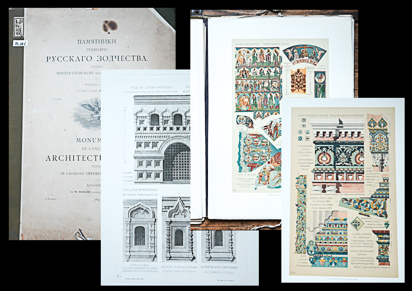 circa 49 x 36 cm., 15 ff., 15 plates (3 in colour-lithograph). Original half-cloth portfolio Only part 3 of 7 with 15 plates, three of which show ornaments in colour. The entire work consists of seven parts with 115 plates, compiled by the Russian architect and archaeologist Vladimir Vasilyevich Suslov (1857-1921). Text in Russian, plates with explanations in French.