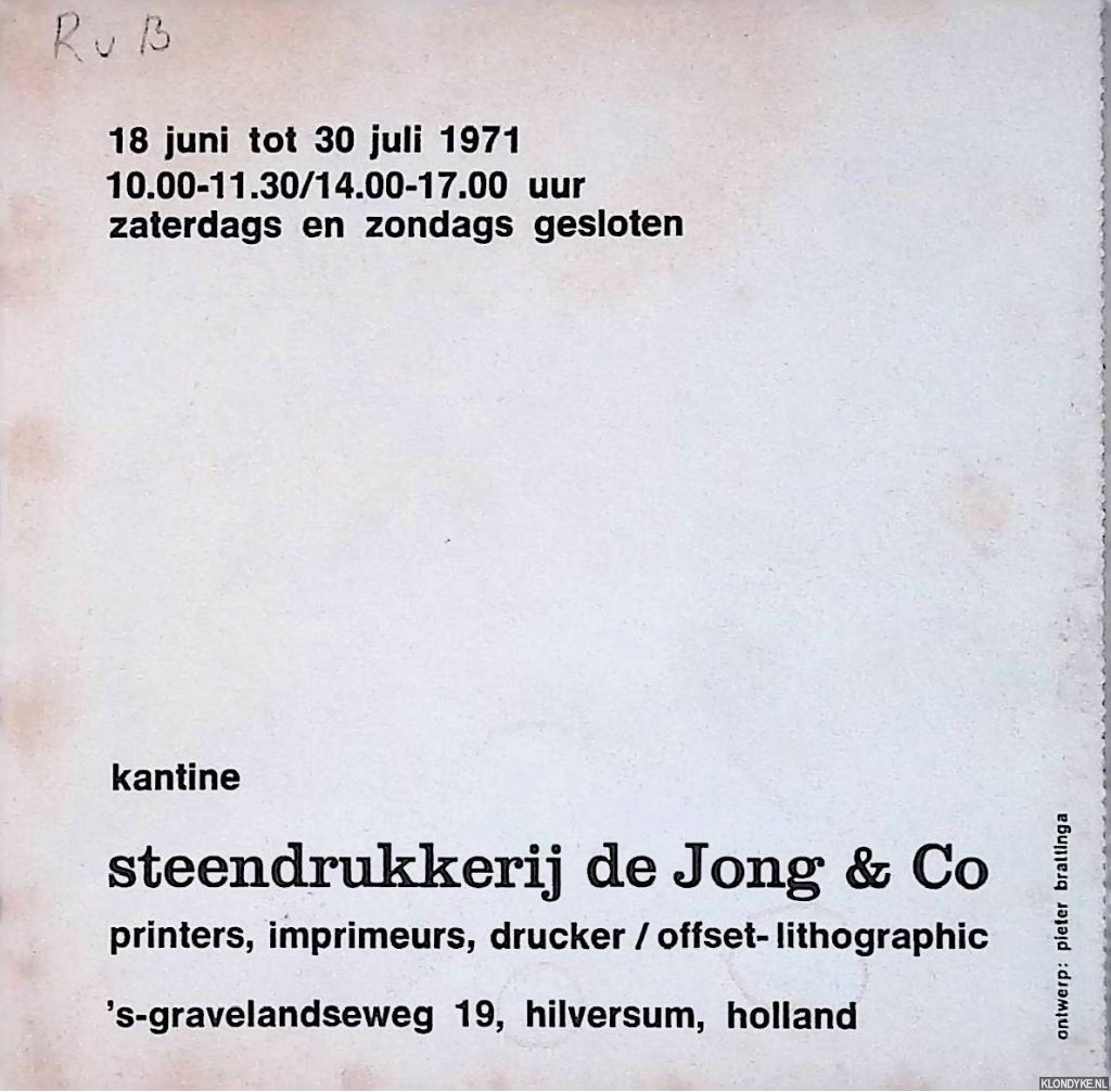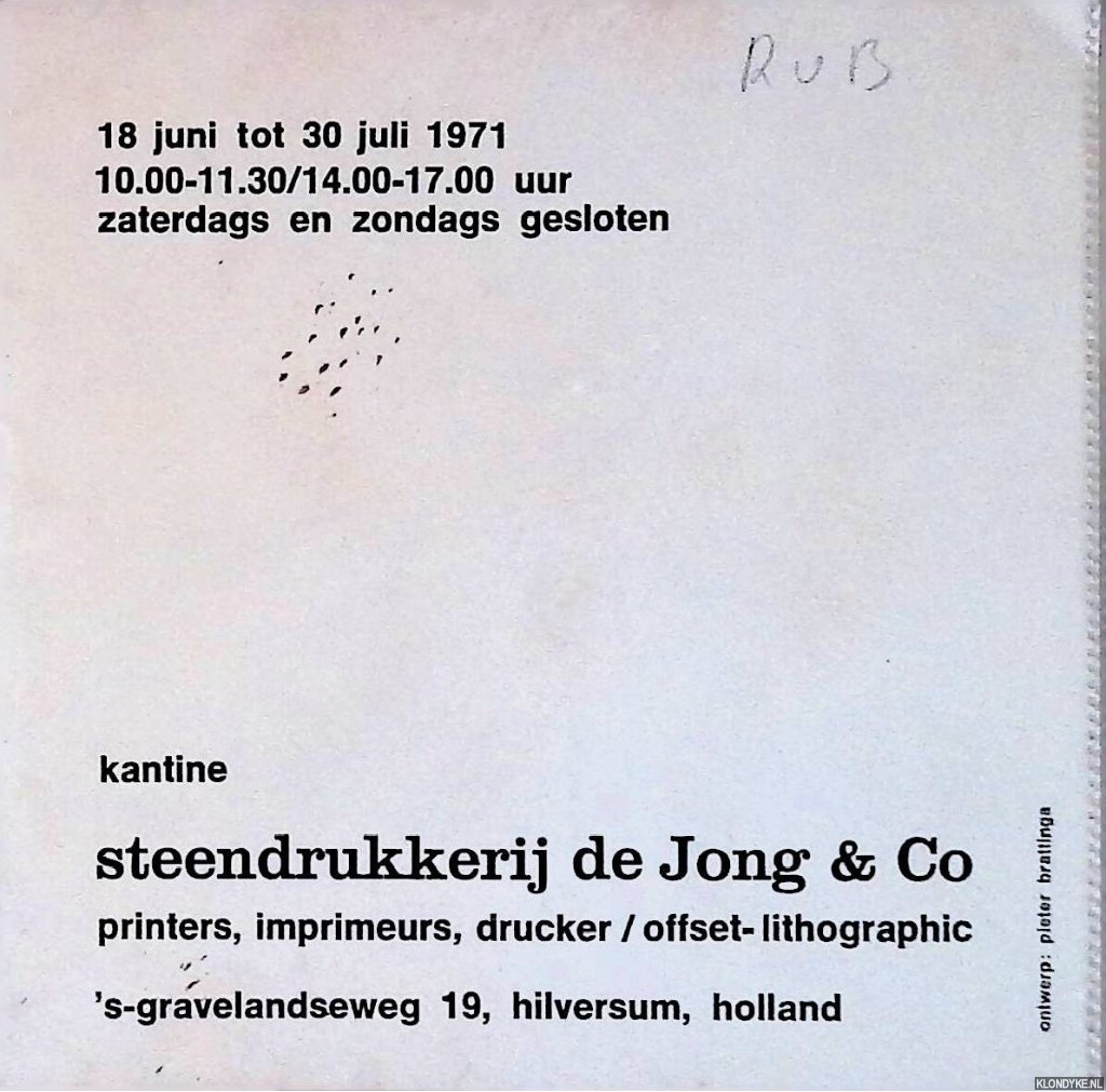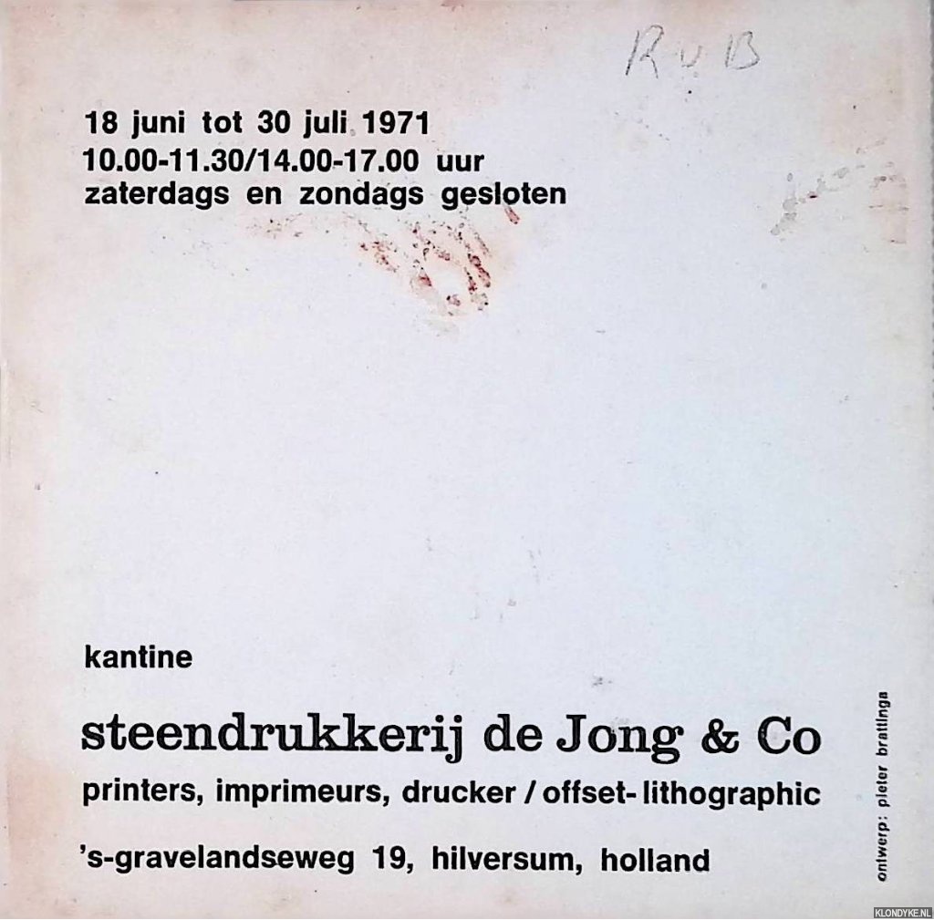 Oorspronkelijk geniet omslag, softcover, veel (paginagrote) illustraties in z/w, tekst in het Nederlands, ongepagineerd, vierkant (circa 12x12cm). Met adressering en frankering. Tentoonstelling 77: 18 juni tot 30 juli 1971 kantine Steendrukkerij de Jong & Co. 12p.