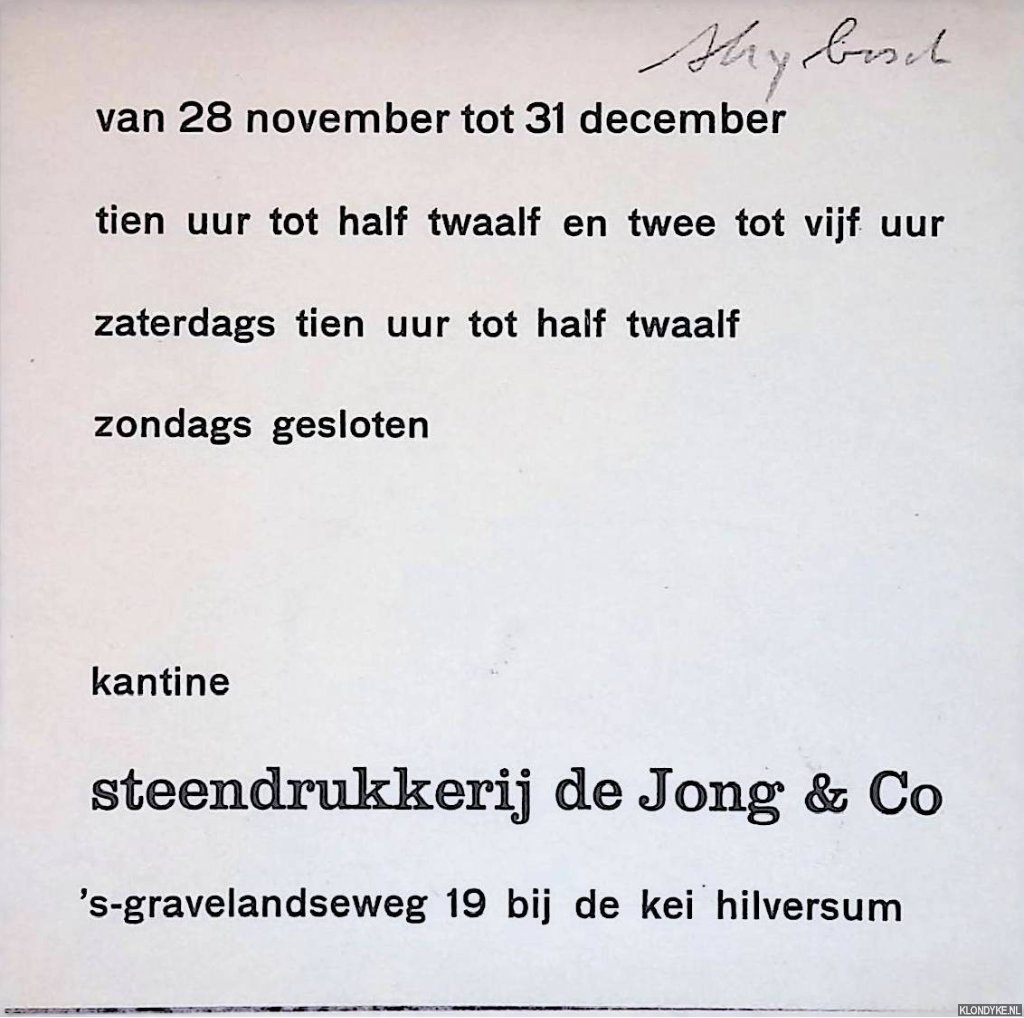 Vouwblad met grote illustratie in z/w aan een zijde, tekst in het Nederlands aan de andere zijde, opgevouwen vierkant (circa 12x12cm) en uitgevouwen circa 35x35cm. Tentoonstelling: 28 november tot 31 december kantine Steendrukkerij de Jong & Co., geopend door de dichter Jan. G. Elburg. p.